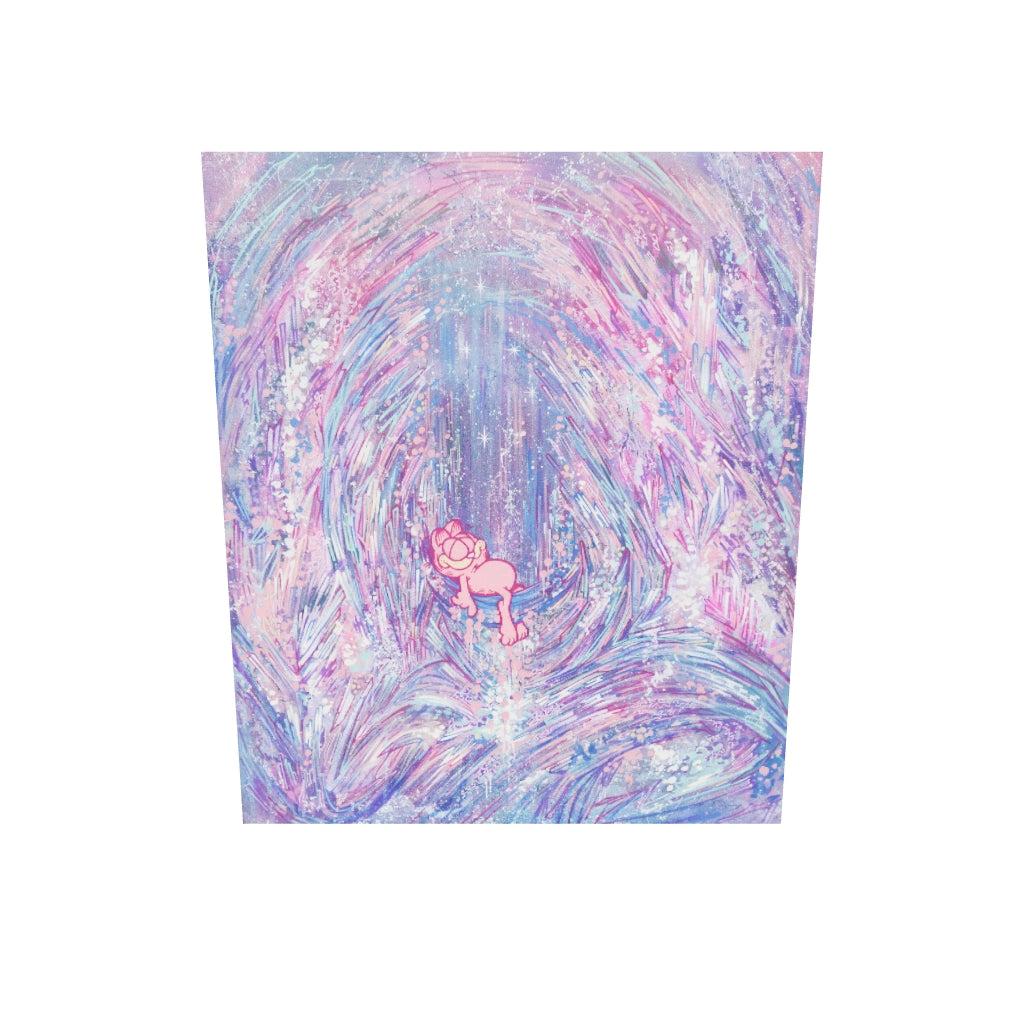 The character lays, nested in a pocket of a different dimension, looking contented and uninterrupted. The soft hues chosen to fill the canvas creates a calm atmosphere, balancing the contrast of energetic movement made through bold mark-making.