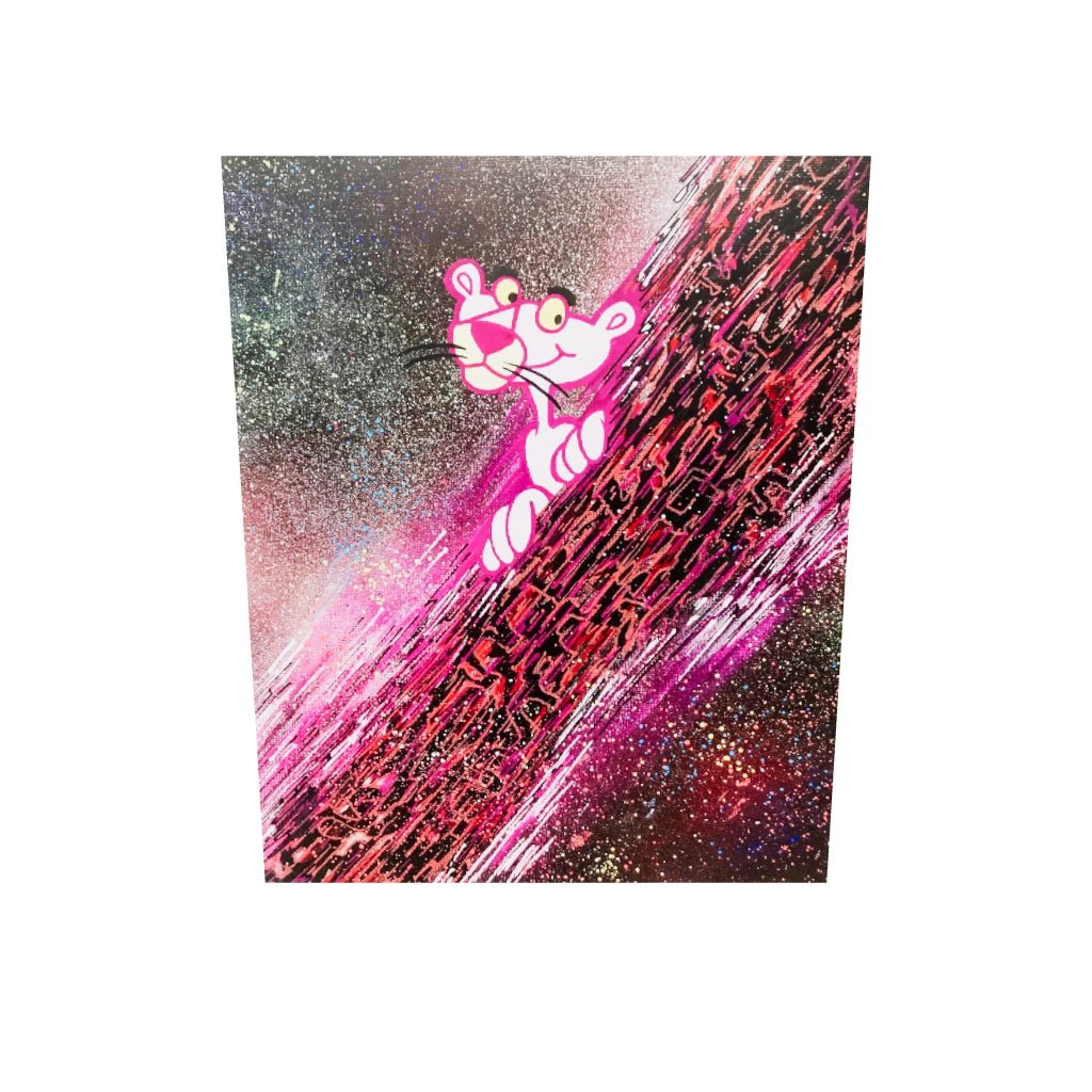 Bringing two universes together, the enamour of outer space blended with the humour of familiar animated characters, Jeremy depicts pop culture icon, ‘The Pink Panther’ in Pink-a-Boo peaking between the layers of this dimension. Using multiple layers of acrylic paint pens and spray paint, Jeremy preserves each layer of this intricate piece by using a spray varnish to set each surface, then continues to add detail once set.