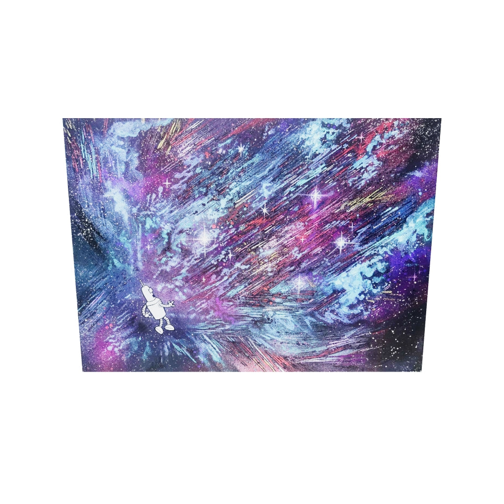 Which Way Is Earth by contemporary street artist, Jeremy Jones is a merge of pop culture references with intricate detailing of the imagined dimension. The scene depicts Futurama's popular animated character ‘Bender’ floating in outer space, engulfed by the unending scene around him. Glimmering stars and rich colour surround the character as he helplessly drifts through the unknown.