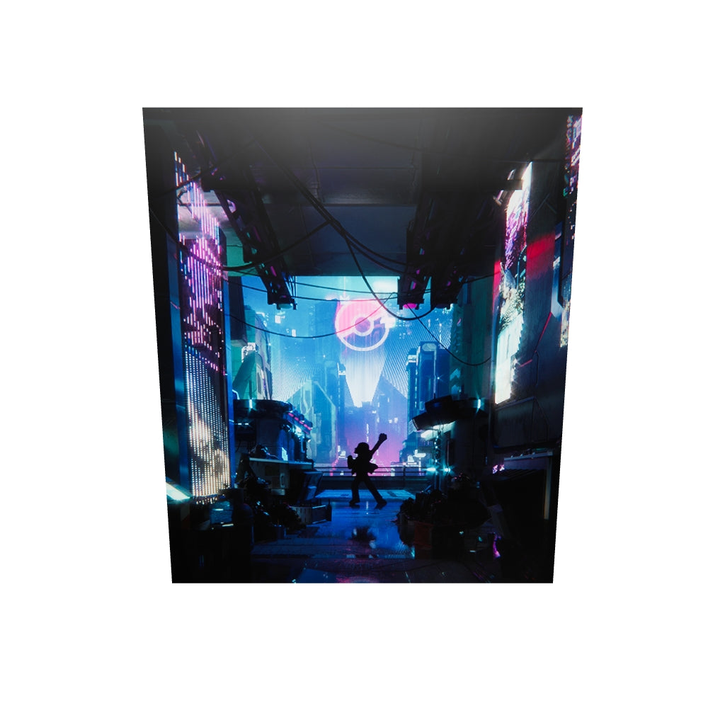 By placing the beloved character’s silhouette in the lower centre of the artwork and juxtaposing it with another iconic symbol, the artist creates an illusion of a dream and a mission, or perhaps a journey that stands before them. The cyber-like setting only emphasizes one’s persistence that transcends time and space whilst showing familiar motifs in an unfamiliar or unexpected environment.